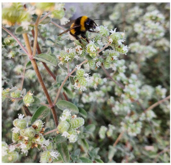 The plant can reach a maximum height of 60 cm and possesses small, simple, and hairy leaves that are oval to oblong in shape, with a characteristic aromatic scent due to the presence of essential oils [2]. The flowers are small, tubular, white or pale pink, hermaphrodite or female, with gray-green spike bracts, and the flowering period extends from May to September [2]. It grows best in well-drained, sandy, or loamy soils and prefers warm and sunny environments in areas with high levels of sunlight and moderate water availability, such as open grasslands, farmed fields, and dry, rocky habitats [3]. Because of its thickened leaf cuticles and trichomes, which reduce water loss, it is well-suited to drought conditions. The nectar-rich blossoms of O. majorana also attract pollinators such as bees and butterflies, which are beneficial to the ecosystem (Figure 1) [4]. Because this plant gives different insect species a place to live and food, it enhances biodiversity in Mediterranean habitats. Additionally, it can improve soil health and discourage some pests as a companion plant, which makes it useful in sustainable farming methods [5,6].