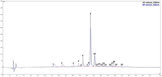 HPLC/DAD chromatograms, visualized at 330 nm of VF (black line) and BP (blue line) extracts from O. majorana. See text for further information and experimental details.