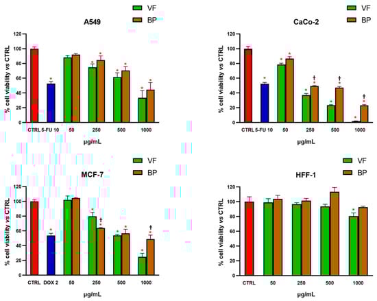 The effect of VF and BP on cell viability was evaluated both in normal and cancer cell lines by the MTT test. As shown in Figure 3, treatment for 72 h resulted in significant and concentration-dependent reduction in cell viability against all tested cancer cell lines (A549, CaCo-2, and MCF-7), with CaCo-2 cells being the most sensitive to the treatments (Table 3). In contrast, the viability of the normal cell line HFF-1 was hardly affected by exposure to the extracts, and only a slight reduction in cell viability was observed after incubation with VF at the highest concentration tested (1000 µg/mL). These findings demonstrate that the extracts exert a selective reduction in cell viability toward cancer cells, supporting their safety in non-cancerous cells.