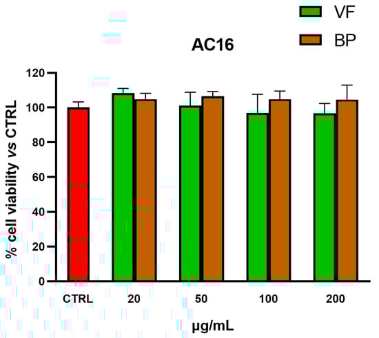Cytotoxic effect of VF and BP hydroalcoholic extracts from O. majorana in AC16 cardiomyocytes. MTT tests were performed in AC16 cells treated with different concentrations of extract (from 20 to 200 μg/mL) for 48 h. Data are represented as the means ± S.D. of three independent experiments. Confidence intervals were calculated by one-way ANOVA test.
