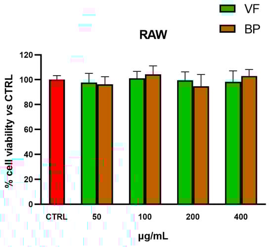 Cytotoxic effect of VF and BP hydroalcoholic extracts from O. majorana in RAW 264.7 macrophages. MTT tests were performed in RAW 264.7 cells treated with different concentrations of extract (from 50 to 400 μg/mL) for 24 h. Data are represented as the means ± S.D. of three independent experiments. Confidence intervals were calculated by one-way ANOVA test.