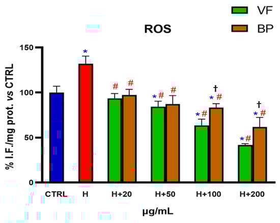 AC16 cells challenged with hemin were used as a model of oxidative stress in order to assess if the antioxidant activity of the extracts, already established in in vitro cell-free systems, was reproducible in a cellular model. Specifically, AC16 cells were pretreated for 48 h with different concentrations of VF or BP (20-50-100-200 µg/mL) and then exposed for 6 h to 1 µM hemin to induce ROS production, thus simulating a condition of oxidative stress. As shown in Figure 6, even the lowest concentration of extracts tested (20 µg/mL) was able to lower intracellular ROS to levels found in control cells. Higher concentration of extracts further diminished hemin-induced ROS production in a concentration-dependent manner, with the VF extract being more powerful than the BP counterpart at the concentrations of 100 and 200 µg/mL. Interestingly, VP and BP reduced ROS levels to below control values when used at 100 and 200 µg/mL.