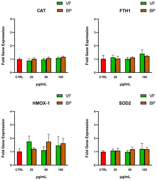 Gene expression levels of antioxidant genes in AC16 cardiomyocytes after exposure to the VP and BP extracts. qPCR analysis of relative gene expression of four endogenous antioxidant enzymes: heme oxygenase-1 (HMOX-1), ferritin heavy chain 1 (FTH1), mitochondrial superoxide dismutase (SOD2), and catalase (CAT) in untreated AC16 (CTRL), and cells pretreated with different concentrations of VF or BP extracts from O. majorana. Each result represents the mean ± S.D. of three experiments. Confidence intervals were calculated by one-way ANOVA test.