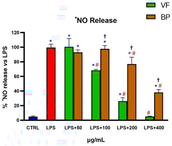 The anti-inflammatory effect of VF and BP was evaluated by using LPS-activated RAW 264.7 cells. Specifically, cells were pretreated with different concentrations (50-100-200-400 µg/mL) of extracts for 6 h, followed by stimulation with LPS (2 µg/mL) for 18 h. The results in Figure 8 show that both extracts exhibited a significant, concentration-dependent anti-inflammatory activity. VF was the most effective, reducing •NO production to levels comparable to untreated control, thereby completely reversing the LPS-induced inflammatory response.