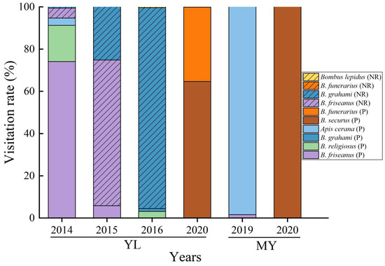 Visitation frequency of pollinators and robbers in both populations of Salvia castanea from 2014 to 2020. YL, Yulong Mountain; MY, Mingyin Town; NR, nectar robber; P, pollinator.
