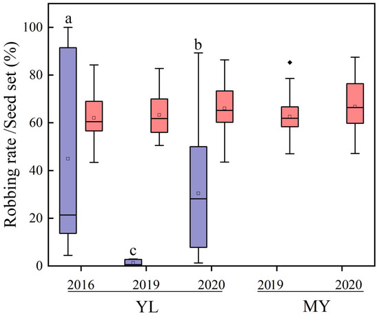 Nectar robbing rate (purple) and seed set (pink) in different years in both populations of Salvia castanea. Different lowercase letters indicate significant differences in nectar robbing rates. The boxes in the figure indicate the 25–75% data distribution range; the black horizontal line inside the box indicates the median; the hollow square inside the box indicates the mean; the upper and lower whisker lines indicate the maximum and minimum values, respectively; and the black solid rhombus outside the upper and lower whisker lines indicates the outliers (All of the following box plots are annotated to match here). YL, Yulong Mountain; MY, Mingyin Town.