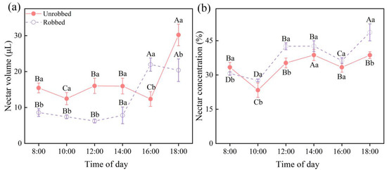 Temporal variation in nectar volume (a) and concentration (b) in robbed and unrobbed flowers. Different capital letters indicate significant differences in nectar volume and concentration between robbed and unrobbed flowers at different times of the day. Different lowercase letters indicate significant differences in nectar volume and concentration between robbed and unrobbed flowers at the same time.