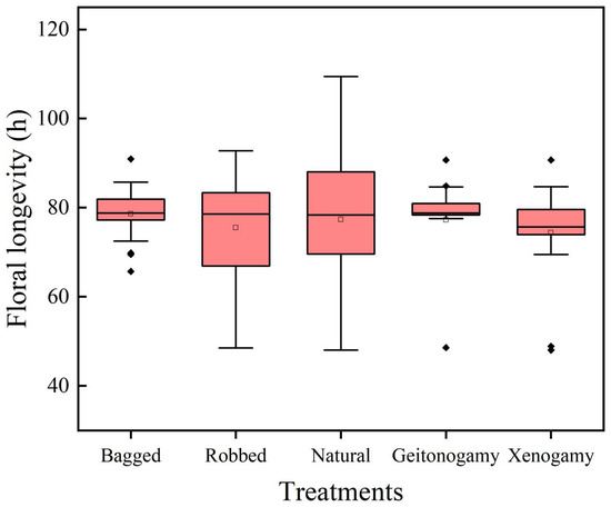 The longevity of the unrobbed flowers was 78.63 ± 1.28 h. No significant differences in longevity were found among the robbed flowers (75.49 ± 2.62 h, p = 0.441), flowers under natural conditions (77.33 ± 3.77 h, p = 0.753), and flowers of geitonogamy and xenogamy (77.22 ± 2.45 h, p = 0.292; χ2 = 1.392, df = 4, p = 0.846; Figure 4).
