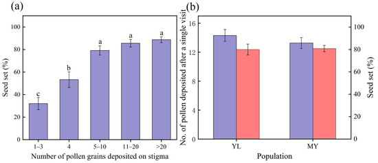 The seed set of different pollen amounts for hand pollination (a), the number of pollen deposited (purple) and seed set (pink) by pollinators in a single visit in two populations (b). Different lowercase letters indicate significant differences in the seed set of different pollen amounts for hand pollination.