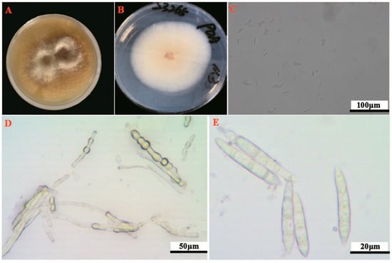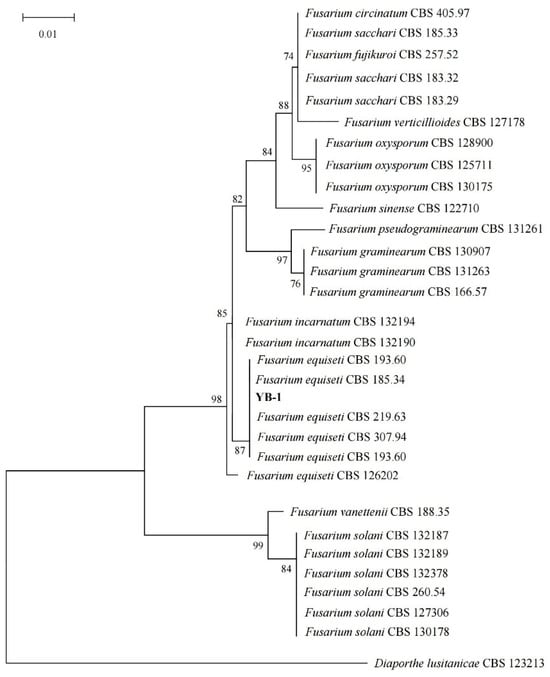 20], and according to the growth of strain YB-1 on PDA medium (25 °C constant temperature), the mycelial morphology, colony characteristics, spore morphology, and sporogenous cell structure were observed. The spore size was calculated using Image Pro Plus 6.0 software, and the preliminary identification was made. After identification, the above-mentioned strains were sent to the Chinese Typical Culture Center of Yunnan Agricultural University and Wuhan University for identification. The fungal species were identified using ITS (Internal Transcribed Spacer, ITS), LSU (Large Subunit of Ribosome, LSU), SSU (Sensory Specific Satiety Units, SSU), TUB (Tubby Bipartite Transcription Factor, TUB), TEF (Transcriptional Enhancer Factor, TEF), 28S (28S Ribosomal RNA, 28S), 18S (18S Ribosomal RNA, 18S) and seven fragments. The fungal gene sequence obtained using sequencing technology was compared with the reference gene sequence in the National Center for Biotechnology Information (NCBI) database using BLAST (v2.15.0+). The top 10 were screened for data analysis, and the representative strains were combined with the reference gene using MEGA11.0 software. The ML method was used to construct a phylogenetic tree [