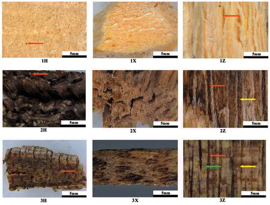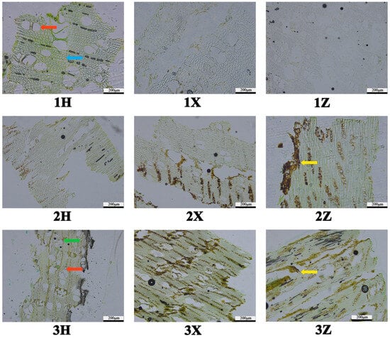 3 cubes for triplanar microtomy (transverse/radial/tangential). Dehydration employed an ethanol–xylene gradient series: 50% ethanol (1% safranin O) → 70% → 80% → 95% → absolute ethanol (2 h/step), followed by xylene infiltration (ethanol–xylene ratios 4:1→3:2→2:3→1:4→pure xylene, 2 h/step). Paraffin embedding (HistoStar™) preceded sectioning on a rotary microtome (Leica RM2235, 5° blade angle) at 20 μm thickness. Selected sections were mounted on adhesive slides, deparaffinized with xylene, and counterstained with 1% fast green FCF in ethanol–xylene (1 min). Permanent mounts were prepared using neutral balsam (Sigma–Aldrich, St. Louis, MO, USA) under controlled humidity (40 ± 5% RH). Brightfield microscopy (Nikon Eclipse Ni-U) with DS-Fi3 camera captured resin deposition patterns at 40–400× magnification, analyzing oleoresin distribution within axial parenchyma and intervascular spaces.