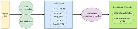 Given these attributes, YOLOv8-BS was developed based on the YOLOv8s architecture, enhancing its capability to process high-resolution imagery for bamboo shoot phenotyping. This adaptation is particularly suited for integrating with remote sensing technologies, where efficient analysis of field-collected data is critical for precision agriculture. The technical route, illustrated in Figure 1, outlines the workflow from data preparation to model training and performance evaluation, providing a structured approach to achieving accurate and rapid phenotyping. This includes data augmentation and annotation to enhance model robustness, followed by training against benchmark models (YOLOv7, YOLOv5, YOLOX, and Faster R-CNN), and a comparative analysis of results focusing on color and spot characteristics.