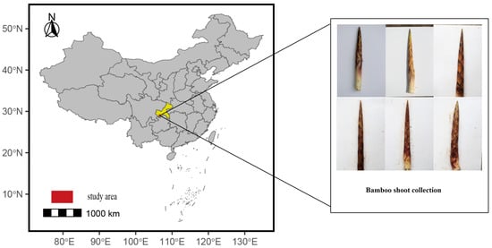 This study was conducted at Jinfo Mountain in the Nanchuan District of Chongqing, China (29.023458° N, 107.193645° E), as shown in Figure 2. The region is characterized by a temperate monsoon climate with rugged terrain, elevations ranging from 1500 to 2000 m, annual rainfall from 1200 to 2000 mm, a frost-free period of about 120 days, and average temperatures between 12 and 15 °C. These conditions create a unique microhabitat for C. utilis, influencing the phenotypic diversity of bamboo shoot sheaths, particularly their color and spotting patterns. The study area was selected to capture a representative range of environmental and phenotypic variations, ensuring a diverse dataset for model training.