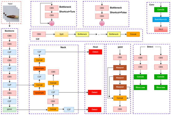 The YOLOv8-BS model, derived from the YOLOv8s framework [54], is a fully convolutional neural network designed for precise phenotyping of bamboo shoot sheaths using high-resolution imagery. Optimized for detecting sheath colors and spotting patterns, the model comprises three core components: a backbone for feature extraction, a neck for feature aggregation, and a detection head for object prediction. Figure 3 illustrates the architecture, depicting the interconnections among these components to process bamboo shoot images effectively. The backbone, built on the YOLOv8s architecture, integrates the C2f (Cross-Stage Partial Fusion) module, an advancement of the CSPNet framework [55]. The C2f module enhances feature extraction depth and expressiveness while reducing computational complexity, making it suitable for high-resolution inputs. Additionally, the backbone employs the RepConv (Re-parameterizable Convolution) module, which uses a multi-branch structure during training to improve nonlinear modeling [56]. At inference, RepConv consolidates into a single branch, balancing efficiency and performance for real-time applications, such as field-based phenotyping. The neck module aggregates multi-scale features from the backbone to enhance detection accuracy across diverse bamboo shoot phenotypes. It incorporates three key components: (1) the Spatial Pyramid Pooling Fast (SPPF) module, which applies multi-scale pooling (e.g., 5 × 5, 9 × 9, 13 × 13 kernels) to capture features from varying sheath sizes, improving robustness in complex field conditions [57]; (2) the Probabilistic Anchor Assignment (PAA) module, which refines sample selection to optimize anchor box assignments, enhancing training efficiency [58]; and (3) the Path Aggregation Network (PAN), which fuses low-level spatial details with high-level semantic information via bidirectional pathways, strengthening feature representation [59]. These components ensure accurate detection of subtle phenotypic variations, such as small spots or faint color gradients. The detection head employs an anchor-free design, directly predicting target center coordinates, bounding box dimensions, and class probabilities for sheath colors and spotting patterns. This approach eliminates the need for predefined anchor boxes, improving training stability and generalization across diverse bamboo shoot morphologies. The model uses the Complete IoU (CIoU) loss function, which accounts for bounding box overlap, aspect ratio, and center distance, to refine localization accuracy [60]. The CIoU loss was selected for its ability to handle the irregular shapes and sizes of bamboo shoot sheaths, ensuring precise phenotyping in remote sensing contexts.