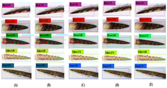 For color detection (Figure 4), YOLOv8-BS (A) exhibited the highest levels of confidence across categories, peaking at 0.94 for black bamboo shoots and achieving consistent scores above 0.85 for mauve, brown, yellow, and green (e.g., 0.89 for yellow). This reflects its superior target recognition, likely due to the optimized C2f and SPPF modules (Section 2.4). YOLOv7 (B) and YOLOv5 (C) showed moderate confidence levels (e.g., 0.90 for black in YOLOv7), whereas YOLOX (D) and Faster R-CNN (E) performed less well, with scores below 0.73 indicating weaker feature extraction in variable field conditions. The stability of YOLOv8-BS under high-confidence demands highlights its architectural advantage over the YOLO series and the traditional Faster R-CNN.