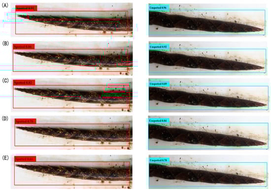 For spot detection (Figure 5), YOLOv8-BS (A) achieved confidence scores of 0.91 for spotted bamboo shoots and 0.96 for unspotted ones, demonstrating the precise differentiation enabled by its anchor-free design (Section 2.5). YOLOv7 (B) recorded 0.86 and 0.92 for spotted and unspotted, respectively, while YOLOv5 (C) and YOLOX (D) declined to 0.78 and 0.66. Faster R-CNN (E) showed the lowest scores (0.66 for spotted and 0.78 for unspotted), likely due to its limited adaptability to complex spot patterns. These results highlight the robustness of YOLOv8-BS, supporting its application in precision bamboo phenotyping.