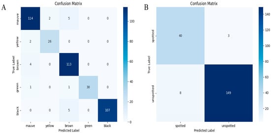 Confusion matrices for YOLOv8-BS. Note: (A) matrix for color detection (mauve, yellow, brown, green, black); (B) matrix for spot detection (spotted, unspotted), showing true vs. predicted labels with counts.