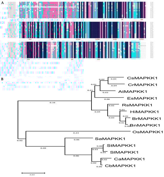 The predicted amino acid residues alignment of Siberian oilseed (Camelina sativa) CsMAPKK1, pink shepherd’s-purse (Capsella rubella) CrMAPKK1, Arabidopsis (Arabidopsis thaliana) AtMAPKK1, saltwater cress (Eutrema salsugineum) EsMAPKK1, radish (Raphanus sativus) RsMAPKK1, Hoary Mustard (Hirschfeldia incana) HiMAPKK1, turnip mustard (Brassica rapa) BrMAPKK1, rapeseed (Brassica napus) BnMAPKK1, rice (Oryza sativa) OsMAPKK1, winged-seed sesame (Sesamum alatum) SaMAPKK1, potato (Solanum tuberosum) StMAPKK1, tomato (Solanum lycopersicum) SlMAPKK1, pepper (Capsicum annuum) CaMAPKK1, and Aji Amarillo (Capsicum baccatum) CbMAPKK1 is displayed in Figure 1A. The protein accession numbers of MAPKK1 from various plant species were identified using NCBI Protein BLAST (https://blast.ncbi.nlm.nih.gov/Blast.cgi?PAGE=Proteins, accessed on 10 December 2023), as listed in Table S1. All MAPKK1 proteins across plant species contained eleven conserved catalytic domains (I–XI) (Figure 1A). Comparative sequence analysis revealed that all examined MAPKK1 orthologs conserve two critical functional domains: the canonical GXGXXG phosphate-binding motif within Subdomain I, and the distinctive catalytic domain VGTxxYM(S/A) PEG in Subdomain VIII (Figure 1A). Phylogenetic analysis of plant MAPKK1 amino acid sequences revealed that StMAPKK1 clusters within a well-supported clade alongside SlMAPKK1, CsMAPKK1, CrMAPKK1, AtMAPKK1, EsMAPKK1, RsMAPKK1, HiMAPKK1, BrMAPKK1, BnMAPKK1, OsMAPKK1, SaMAPKK1, SlMAPKK1, CaMAPKK1, and CbMAPKK1, as displayed in Figure 1B, suggesting functional conservation across these orthologs. Furthermore, phylogenetic analysis revealed that StMAPKK1 shares high sequence similarity and clusters closely with SlMAPKK1 (Solanum lycopersicum), CaMAPKK1 (Capsicum annuum), and CbMAPKK1 (Capsicum baccatum), forming a well-supported Solanaceae-specific clade (Figure 1B). Interestingly, this group also showed significant affinity with SaMAPKK1 (Sesamum alatum) from the Pedaliaceae family. The strong phylogenetic conservation among these MAPKK1 homologs suggests they likely share functional similarities and may have undergone parallel evolutionary selection pressures within the clades.
