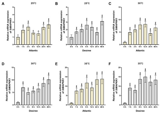 We investigated the relative expression patterns of StMAPKK1 in potato cultivars ‘Atlantic’ and ‘Desiree’ under heat stress conditions at 25 °C, 30 °C, and 35 °C across multiple time points (0, 1, 3, 6, 12, 24, and 48 h). Under 25 °C stress (Figure 2A,B), ‘Atlantic’ displayed a fluctuating upregulation pattern with increased expression at 1 and 3 h, followed by a decrease at 6 h, continued decline at 12 h, and significant enhancement at 24 and 48 h. In contrast, ‘Desiree’ showed an overall increasing trend characterized by initial upregulation (1, 3, and 6 h), subsequent downregulation (12 and 24 h), and peak expression at 48 h. At 30 °C (Figure 2C,D), ‘Atlantic’ maintained general upregulation despite fluctuations, with continuous increases from 1 to 12 h, a temporary decrease at 24 h, and recovery at 48 h. Similarly, ‘Desiree’ exhibited predominant upregulation with marked increase at 1 h, slight decrease at 3 h, followed by progressive elevation through 48 h, reaching maximum expression. Under 35 °C stress (Figure 2E,F), ‘Atlantic’ demonstrated strong upregulation with continuous increases from 1 to 6 h, a minor decrease at 12 h, and sustained high expression levels at 24 and 48 h (peaking at 48 h). ‘Desiree’ also showed significant upregulation: rapid increase at 1 h, slight decrease at 3 h, progressive rise to peak at 12 h, modest decline at 24 h, and subsequent increase at 48 h. These results demonstrate distinct temporal expression patterns of StMAPKK1 between cultivars under heat stress, revealing genotype-specific thermoresponse characteristics. The differential regulation indicates StMAPKK1’s involvement in potato heat stress responses, with its expression patterns being modulated by cultivar-specific genetic backgrounds.