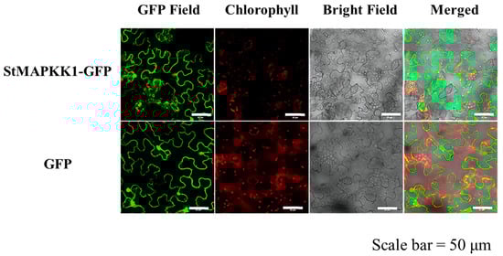 Subcellular localization of StMAPKK1-GFP fusion protein. Confocal laser scanning microscopy was conducted to analyze tobacco plants transformed with the pCAM35-GFP-StMAPKK1 construct. The empty vector expressing only GFP was used as a control. Scale bar = 50 μm.