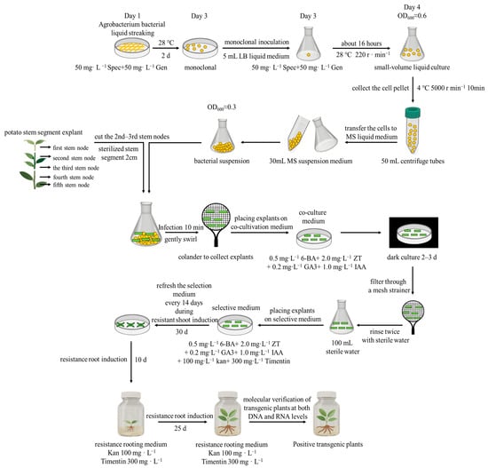 Following the established protocol [47], the StMAPKK1 coding sequence was cloned into pBI121-EGFP, generating the overexpression construct. To achieve gene knockdown, an RNAi expression vector was prepared according to the method described by [48]. All primer sequences are listed in Table S2. The transformation procedure involved culturing recombinant Agrobacterium tumefaciens strain LBA4404 in antibiotic-supplemented LB medium (50 mg/L each of gentamicin and spectinomycin) at 28 °C for 48 h. Bacterial cells were then concentrated by centrifugation at 5000 rpm for 10 min and adjusted to OD600 = 0.3 in MS liquid medium. Sterilized stem segments (2 cm length) were immersed in this suspension for 10 min before transfer to co-culture medium containing plant growth regulators (0.5 mg/L 6-BA, 2.0 mg/L ZT, 0.2 mg/L GA3, and 1.0 mg/L IAA) and maintained in darkness for 2–3 days. Selection of transformed tissues was performed on media supplemented with 100 mg/L kanamycin and 300 mg/L Timentin, with sub-culturing every 14 days. Developing shoots were subsequently transferred to rooting medium (MS + 7.4 g/L agar + 30 g/L sucrose + 300 mg/L Timentin + 100 mg/L kan, pH = 5.8) for complete plant regeneration.