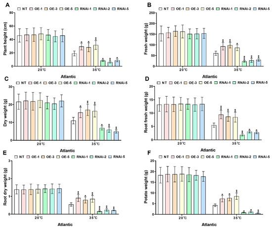 StMAPKK1 modulates potato growth parameters of cultivar ‘Atlantic’; (A) plant height, (B) fresh weight, (C) dry weight, (D) root fresh weight, (E) root dry weight, and (F) potato weight, after exposure to 20 °C and 35 °C of heat stress treatments. NT, non-transgenic plants; OE, pBI121-EGFP-StMAPKK1-transgenic plants (OE-1, OE-3, and OE-5); RNAi, pART-StMAPKK1- RNAi-transgenic plants (RNAi-1, RNAi-2 and RNAi-5). The data are presented as mean ± standard deviation. p-values (* p < 0.05, ** p < 0.01, *** p < 0.001) were calculated through ordinary two-way ANOVA followed by Tukey’s multiple comparisons test with a sample size of n = 9.