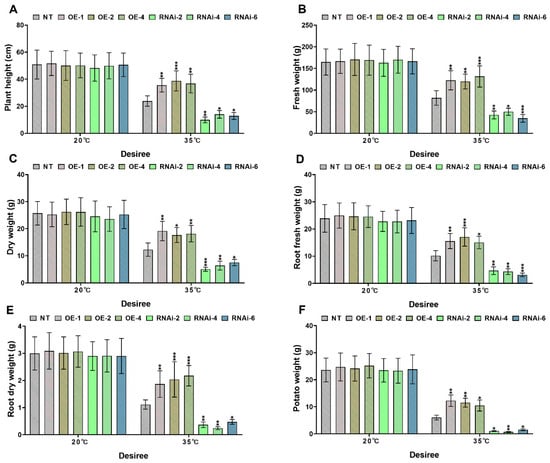 StMAPKK1 modulates potato growth parameters of cultivar ‘Desiree’; (A) plant height, (B) fresh weight, (C) dry weight, (D) root fresh weight, (E) root dry weight, and (F) potato weight, after exposure to 20 °C and 35 °C of heat stress treatments. NT, non-transgenic plants; OE, pBI121-EGFP-StMAPKK1-transgenic plants (OE-1, OE-2, and OE-4); RNAi, pART-StMAPKK1- RNAi-transgenic plants (RNAi-2, RNAi-4 and RNAi-6). The data are presented as mean ± standard deviation. p-values (* p < 0.05, ** p < 0.01, *** p < 0.001) were calculated through ordinary two-way ANOVA followed by Tukey’s multiple comparisons test with a sample size of n = 9.