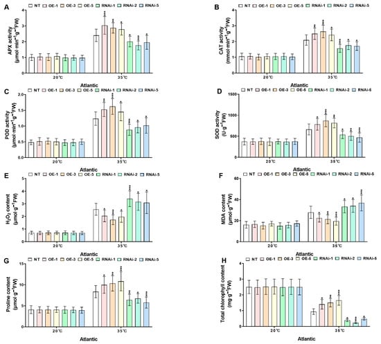 StMAPKK1 modulates potato physiological indices of cultivar ‘Atlantic’; (A) APX activity, (B) CAT activity, (C) POD activity, (D) SOD activity, (E) H2O2 content, (F) MDA content, (G) Proline content, and (H) Total chlorophyll content, after exposure to 20 °C and 35 °C of heat stress treatments. NT, non-transgenic plants; OE, pBI121-EGFP-StMAPKK1-transgenic plants (OE-1, OE-3, and OE-5); RNAi, pART-StMAPKK1-RNAi-transgenic plants (RNAi-1, RNAi-2 and RNAi-5). The data are presented as mean ± standard deviation. p-values (* p < 0.05, ** p < 0.01, *** p < 0.001) were calculated through ordinary two-way ANOVA followed by Tukey’s multiple comparisons test with a sample size of n = 9.