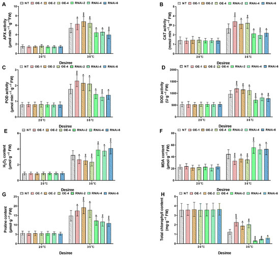 StMAPKK1 modulates potato physiological indices of cultivar ‘Desiree’; (A) APX activity, (B) CAT activity, (C) POD activity, (D) SOD activity, (E) H2O2 content, (F) MDA content, (G) Proline content, and (H) Total chlorophyll content, after exposure to 20 °C and 35 °C of heat stress treatments. NT, non-transgenic plants; OE, pBI121-EGFP-StMAPKK1-transgenic plants (OE-1, OE-2, and OE-4); RNAi, pART-StMAPKK1-RNAi-transgenic plants (RNAi-2, RNAi-4 and RNAi-6). The data are presented as mean ± standard deviation. p-values (* p < 0.05, ** p < 0.01, *** p < 0.001) were calculated through ordinary two-way ANOVA followed by Tukey’s multiple comparisons test with a sample size of n = 9.