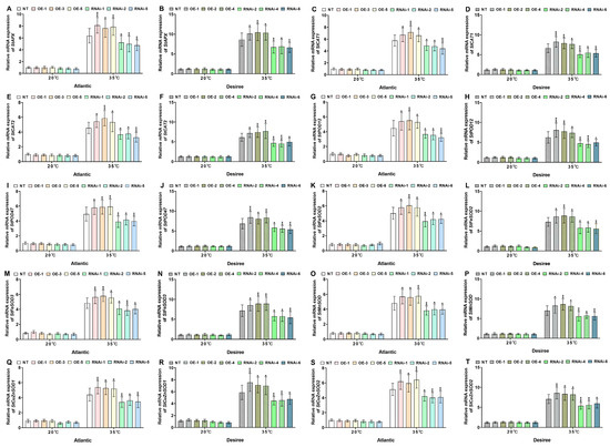 StMAPKK1 regulates the relative mRNA expression of potato plants of cultivar ‘Atlantic’ ‘Desiree’; (A,B) StAPX, (C,D) StCAT1, (E,F) StCAT2, (G,H) StPOD12, (I,J) StPOD47, (K,L) StFeSOD2, (M,N) StFeSOD3, (O,P) StMnSOD, (Q,R) StCuZnSOD1, and (S,T) StCuZnSOD2, respectively, after exposure to 20 °C and 35 °C of heat stress. In the ‘Atlantic’ cultivar: NT, non-transgenic plants; OE, pBI121-EGFP-StMAPKK1-transgenic plants (OE-1, OE-3, and OE-5); RNAi, pART-StMAPKK1-RNAi-transgenic plants (RNAi-1, RNAi-2, and RNAi-5). In the ‘Desiree’ cultivar: NT, non-transgenic plants; OE, pBI121-EGFP-StMAPKK1-transgenic plants (OE-1, OE-2, and OE-4); RNAi, pART-StMAPKK1-RNAi-transgenic plants (RNAi-2, RNAi-4, and RNAi-6). The data are presented as mean ± standard deviation. p-values (* p < 0.05, ** p < 0.01, *** p < 0.001) were calculated through ordinary two-way ANOVA followed by Tukey’s multiple comparisons test with a sample size of n = 9.