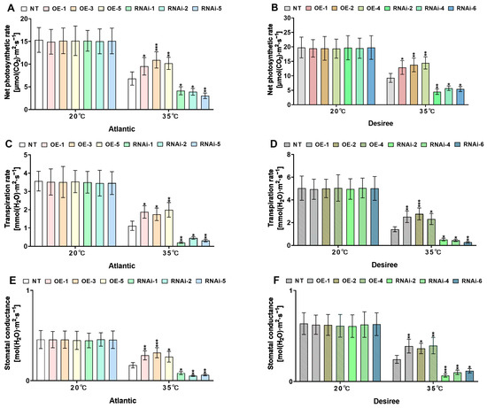 StMAPKK1 regulates the photosynthetic traits of potato plants of cultivars, ‘Atlantic’ and ‘Desiree’; (A,B) net photosynthetic rates, (C,D) transpiration rates, and (E,F) stomatal conductance, respectively, after exposure to 20 °C and 35 °C of heat stress treatments. In the ‘Atlantic’ cultivar: NT, non-transgenic plants; OE, pBI121-EGFP-StMAPKK1-transgenic plants (OE-1, OE-3, and OE-5); RNAi, pART-StMAPKK1-RNAi-transgenic plants (RNAi-1, RNAi-2, and RNAi-5). In the ‘Desiree’ cultivar: NT, non-transgenic plants; OE, pBI121-EGFP-StMAPKK1- transgenic plants (OE-1, OE-2, and OE-4); RNAi, pART-StMAPKK1-RNAi-transgenic plants (RNAi-2, RNAi-4, and RNAi-6). The data are presented as mean ± standard deviation. p-values (* p < 0.05, ** p < 0.01, *** p < 0.001) were calculated through ordinary two-way ANOVA followed by Tukey’s multiple comparisons test with a sample size of n = 9.