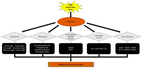 A proposed model illustrating the role of StMAPKK1 in potato plants’ responses to heat stress. Under high-temperature stress, StMAPKK1 enhances tolerance by regulating growth, biomass, photosystem efficiency, oxidative markers, and antioxidant enzymes while promoting osmoregulatory compounds to reduce ROS accumulation. It also mediates the upregulation of stress-responsive genes, contributing to improved stress adaptation.