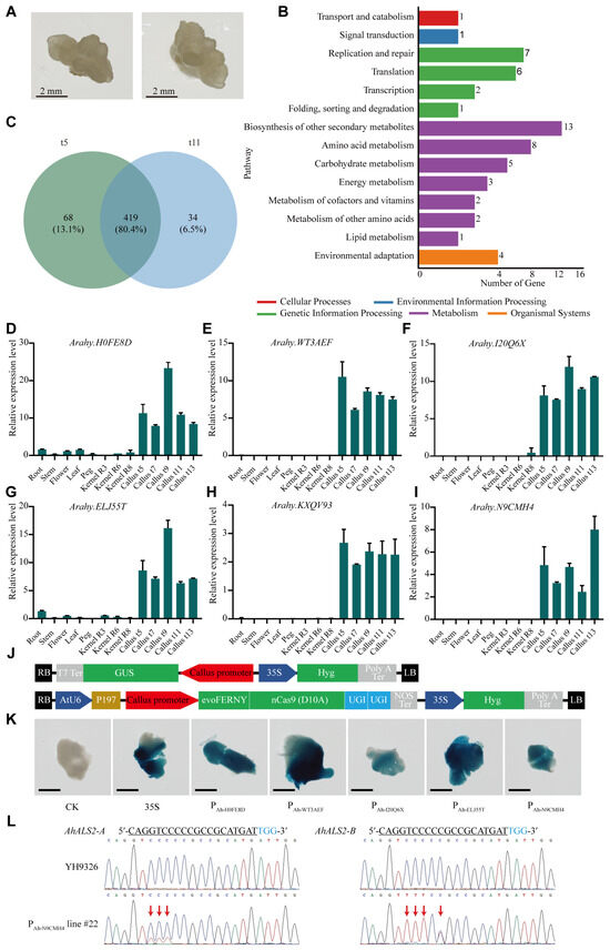 Identification of peanut callus-specific genes via RNA sequencing and validation. (A) Representative images of t5 and t11 peanut callus samples. (B) Kyoto encyclopedia of genes and genomes (KEGG) enrichment analysis of differentially expressed genes between t5 and t11 peanut callus samples. (C) Venn diagram showing the overlap of highly expressed genes found in both t5 and t11 peanut callus samples. (D–I) Tissue-specific expression profiles of candidate callus-specific genes: Arahy.H0FE8D (D), Arahy.WT3AEF (E), Arahy.I20Q6X (F), Arahy.ELJ55T (G), Arahy.KXQV93 (H), and Arahy.N9CMH4 (I) across various peanut tissues. R3, R6, and R8 represent reproductive stages: beginning pod, full seed, and harvest maturity, respectively. The housekeeping gene AhADH3 was used as an internal control. Data are shown as mean ± SD from three biological replicates and four technical replicates. (J) Schematic diagram of the T-DNA constructs used for β-glucuronidase (GUS) reporter gene expression and cytosine base editing. T7 Ter: bacteriophage T7 RNA polymerase terminator; AtU6: Arabidopsis U6 promoter; 35S: 35S promoter of cauliflower mosaic virus; Callus promoter: PAh-H0FE8D, PAh-WT3AEF, PAh-I20Q6X, PAh-ELJ55T, or PAh-N9CMH4; EvoFERNY: evolved cytidine deaminase; nCas9(D10A): Cas9 nickase; UGI: uracil-DNA glycosylase inhibitor; Hyg: hygromycin resistance gene; RB and LB: right and left T-DNA borders. (K) Histochemical staining of peanut callus transformed with GUS reporter gene driven by the 35S, PAh-H0FE8D, PAh-WT3AEF, PAh-I20Q6X, PAh-ELJ55T, and PAh-N9CMH4 promoters, respectively. “CK” represents a control non-transformed YH9326 callus. Scale bar = 1 mm. (L) Representative Sanger sequencing chromatograms of the edited target sites of AhALS2-A and AhALS2-B. Target sequences are underlined, with the protospacer adjacent motif sequences and nucleotide mutations highlighted in blue and red, respectively.