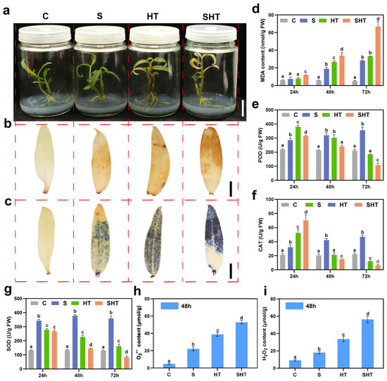 Physiological and biochemical responses of Dendrobium huoshanense under salt (S) stress, high-temperature (HT) stress, and combined (SHT) stress. (a) Phenotypic appearance of D. huoshanense plants after 72 h of exposure to S, HT, or SHT. Scale bar = 2 cm. (b) DAB (3,3′-diaminobenzidine) staining of leaves after 48 h of treatment, showing hydrogen peroxide (H2O2) accumulation as a brown precipitate. Scale bar = 0.5 cm. (c) NBT (nitroblue tetrazolium) staining of leaves after 48 h, showing superoxide anion (O2−) accumulation as a blue precipitate. Red dashed lines indicate separation between different treatment groups for clarity. Scale bar = 0.5 cm. (d) Total malondialdehyde (MDA) content in plants under each stress condition. (e–g) Activities of antioxidant enzymes under each stress: (e) superoxide dismutase (SOD), (f) catalase (CAT), and (g) peroxidase (POD). (h,i) ROSlevels in leaves after 48 h of treatment: (h) superoxide anion content and (i) hydrogen peroxide content. Data are presented as mean ± SE (n = 3). Different lowercase letters (a, b, c, d) indicate significant differences among treatments based on one-way ANOVA followed by Duncan’s multiple range test (p < 0.05).