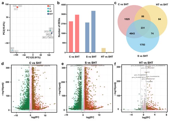 Physiological analysis showed that the combination of salt and high-temperature stress had a greater effect on D. huoshanense than either stress alone. The transcriptome of D. huoshanense under the three stresses was sequenced and analyzed to elucidate the combined effects of salt and high temperature stress at the molecular level. PCA results showed that the four groups could be separated in the PC1 × PC2 score plots, and there was a noticeable grouping trend between SHT and HT (Figure 2a). The number of DEGs was analyzed via transcriptome sequencing. A standard (p < 0.05 and Log2FoldChange ≥ 1) was used to screen DEGs. Compared with SHT, 6485 (2929 upregulated 3556 downregulated), 6714 (2822 upregulated and 3919 downregulated), and 475 (415 upregulated 60 downregulated) DEGs were identified in samples of C, S, and HT, respectively (Figure 2b,d–f). A statistical analysis of the DEGs in the three groups (C vs. SHT, S vs. SHT, HT vs. SHT) revealed 231 DEGs that were common to the three groups (Figure 2c).