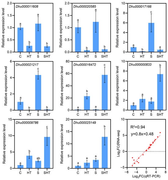 qRT-PCR validation of selected DEGs under the stress treatments. For representative genes, bar charts show the relative expression levels under control, salt, high-temperature, and combined stress conditions. Actin is an internal reference gene. The close agreement between the qRT-PCR results and RNA-seq data confirms the reliability of the transcriptomic analysis. The red solid line represents the regression fit between qRT-PCR and RNA-seq data, indicating the close agreement between the two datasets. Different letters (a, b, c, d) indicate statistically significant differences among treatments as determined by one-way ANOVA followed by Duncan’s multiple range test (p < 0.05).