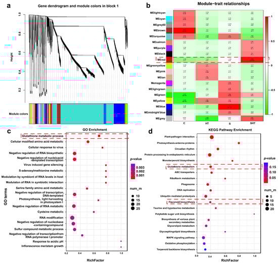 Identification of WGCNA gene co-expression modules and their correlation with stress treatments. (a) Clustering dendrogram of DEGs based on topological overlap, with modules labeled in different colors. (b) Heatmap showing correlations between module eigengenes and the stress conditions (green and red denote positive and negative correlations, respectively). (c) Gene Ontology (GO) enrichment analysis for genes in the red module. (d) KEGG pathway enrichment analysis for genes in the red module. Identification and correlation analysis of WGCNA modules. Red dashed lines in (b–d) highlight key modules or enriched pathways related to glutathione and flavonoid metabolism under stress conditions.