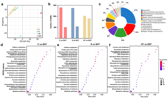 Distribution of differentially accumulated metabolites (DAMs) in D. huoshanense under salt, high-temperature, and combined stress. (a) Principal component analysis (PCA) of the metabolome under control and stress conditions. (b) Numbers of metabolites that show increased accumulation (upregulated, left) or decreased accumulation (downregulated, right) under each stress condition. Red represents control vs. combined stress, blue represents salt vs. combined stress and yellow represents high temperature vs. combined stress (c) Classification and proportional representation of DAMs by metabolic category. (d–f) KEGG pathway enrichment analyses for metabolites in the comparisons of control vs. combined stress, salt vs. combined stress, and high-temperature vs. combined stress, respectively.