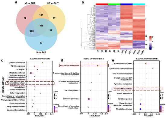 Analysis of DAMs that are common to all three stress comparisons (C vs. SHT, S vs. SHT, and HT vs. SHT). (a) Venn diagram showing the overlap of DAMs among the three comparisons (the center subset represents metabolites shared by all three). (b) Cluster analysis of the metabolites shared among all three comparisons, revealing three distinct clusters (Class I, II, and III) with different accumulation patterns. (c–e) KEGG enrichment analyses for the metabolites in Class I, Class II, and Class III, respectively. Red dashed lines in (c–e) highlight key modules or enriched pathways related to glutathione and flavonoid metabolism under stress conditions.