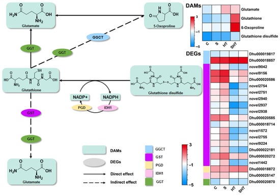 Differential changes in genes and metabolites involved in the glutathione (GSH) metabolism pathway under stress. Enzymes in the pathway are labeled by their gene symbols: GGCT (gamma-glutamylcyclotransferase), GST (glutathione S-transferase), PGD (6-phosphogluconate dehydrogenase), IDH1 (isocitrate dehydrogenase), and GGT (gamma-glutamyltranspeptidase). Changes in gene expression (DEGs) and metabolite levels (DAMs) are indicated as log2 fold changes relative to the control.