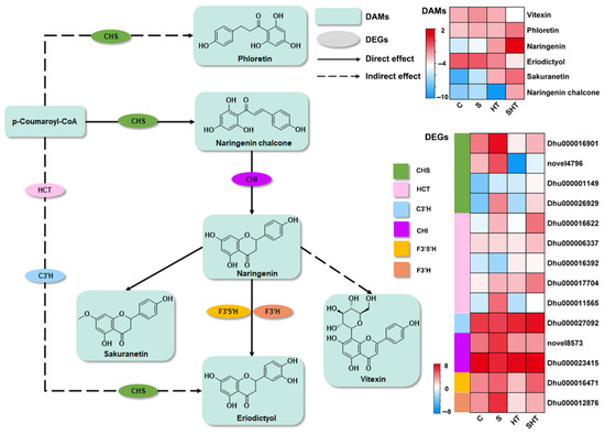 Differential changes in genes and metabolites involved in the flavonoid biosynthesis pathway under stress. Enzymes are labeled by their gene symbols: CHS (chalcone synthase), HCT (shikimate O-hydroxycinnamoyl transferase), C3′H (flavonoid 3′-hydroxylase), CHI (chalcone isomerase), F3′5′H (flavonoid 3′,5′-hydroxylase), and F3′H (flavonoid 3′-hydroxylase). The changes in gene expression and in flavonoid metabolite accumulation are shown as log2 fold changes compared to the control.