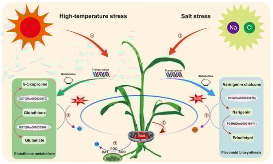 This study reveals the coordinated response mechanisms of D. huoshanense under combined salt and high-temperature stress through integrated physiological, transcriptomic, and metabolomic analyses. High temperature emerged as the dominant factor shaping the stress response, inducing pronounced changes in gene expression and metabolite accumulation. The plant activates both enzymatic antioxidants (such as SOD, POD, and CAT) and non-enzymatic antioxidants (including glutathione and flavonoids) to alleviate oxidative damage. Metabolomic profiling highlighted significant enrichment in glutathione metabolism and flavonoid biosynthesis, while transcriptomic data demonstrated dynamic regulation of key stress-responsive genes such as GST, CHS, and CHI. As shown in Figure 9, we propose a regulatory model summarizing these findings, in which ROS accumulation under combined stress activates antioxidant enzyme activity and triggers downstream metabolic reprogramming. This model illustrates how D. huoshanense employs a multifaceted antioxidant strategy—through the activation of enzymatic defenses (e.g., SOD, POD, CAT) and the accumulation of antioxidant metabolites (e.g., glutathione and flavonoids)—to mitigate ROS accumulation and enhance tolerance to abiotic stress. Together, these findings provide molecular targets such as CHI, CHS, and glutathione metabolic enzymes, which could be explored in future genetic engineering or molecular breeding efforts to enhance stress resilience in D. huoshanense. The significantly altered metabolite profiles may also serve as potential biomarkers for stress tolerance screening.