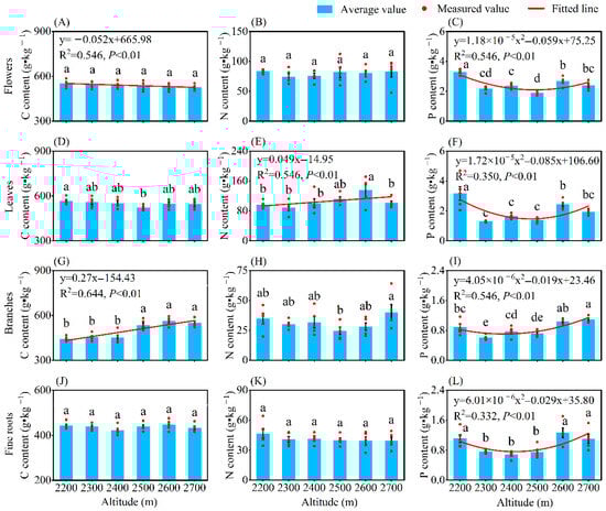 Changes in C, N, and P contents of plant organs along an altitudinal gradient. Note: (A) Flowers C content; (B) Flowers N content; (C) Flowers P content; (D) Leaves C content; (E) Leaves N content; (F) Leaves P content; (G) Branches C content; (H) Branches N content; (I) Branches P content; (J) Fine roots C content; (K) Fine roots N content; (L) Fine roots P content. Different lower-case letters indicate significant differences among altitudes (p < 0.05, Duncan’s test).