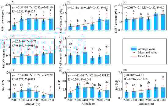 Altitude also significantly altered soil elemental contents (p < 0.05, Figure 2A–E). Soil C content exhibited a unimodal pattern along the altitudinal gradient (p < 0.05), peaking at an altitude of 2400 m. However, soil N, P, and AN (available nitrogen) showed a linearly increasing pattern with rising altitude.