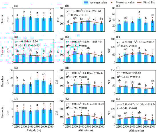 Changes in the stoichiometric ratios of plant organs along an altitudinal gradient. Note: (A) Flowers C:N; (B) Flowers C:P; (C) Flowers N:P; (D) Leaves C:N; (E) Leaves C:P; (F) Leaves N:P ; (G) Branches C:N; (H) Branches C:P; (I) Branches N:P; (J) Fine roots C:N content; (K) Fine roots C:P; (L) Fine roots N:P. Different lower-case letters express significant differences among altitudes (p < 0.05, Duncan’s test).