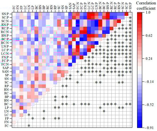 Correlations among C, N, and P contents and the stoichiometric ratios of plant organs and soil. Note: * indicates significant correlations (p < 0.05). FC, FN, FP, LC, LN, LP, BC, BN, BP, RC, RN, RP, SC, SN, SP, SAN, and SAP in Figure 4 denote carbon (C), nitrogen (N) and phosphorus (P) contents in flowers (F), leaves (L), branches (B), fine roots (R), and soil (S), as well as soil available nitrogen (AN) and available phosphorus (AP) contents. FC:N, FC:P, FN:P, LC:N, LC:P, LN:P, BC:N, BC:P, BN:P, RC:N, RC:P, RN:P, SC:N, SC:P, and SN:P in this figure represent the ratios of carbon, nitrogen, and phosphorus in flowers, leaves, branches, fine roots, and soil, respectively.
