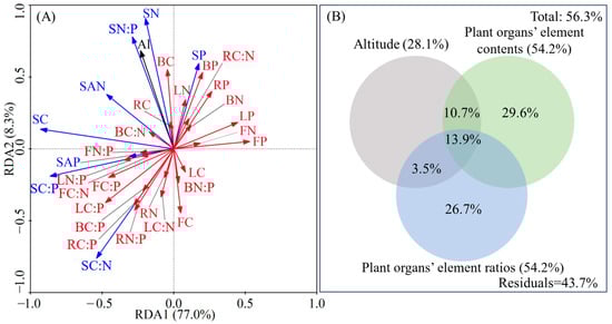 Relationships among altitude, plant elements and soil nutrients (A), and the contribution of altitude and plant elements to soil nutrient variability (B). The abbreviations in (A) maintain identical definitions to those provided in Figure 4.