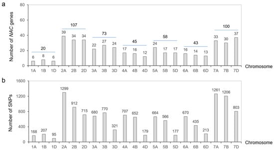 Chromosome distribution of TaNAC genes and their SNPs. (a) Number of TaNAC genes distributed on wheat chromosomes. (b) Number of SNPs derived from TaNACs on each chromosome.