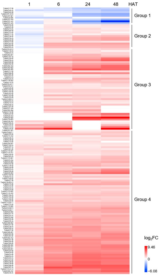 Transcriptome sequencing of roots in CH7034 revealed that among the 446 TaNACs, 144 genes showed significant changes in expression levels at least two time points after salt stress (Table S2). These differentially expressed genes were divided into four groups (Figure 3). Group 1 exhibited a downregulation trend under salt stress, Group 2 downregulated its expression within 1 h after treatment (HAT) and then continued to increase thereafter, Group 3 showed specific upregulation of expression at two or three time points, and the remaining Group 4, containing the largest number of 78 genes, exhibited a successive upregulation trend after salt treatment (Figure 3).