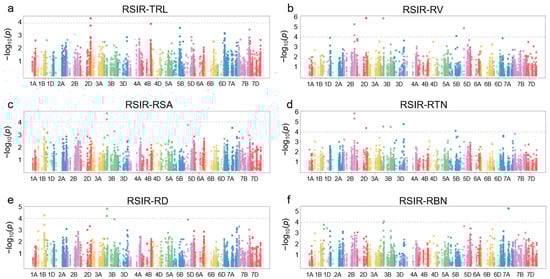 Manhattan plot of association analysis between TaNAC genes and root salt-tolerance phenotypes in 114 wheat accessions. (a) Relative salt-injury rate (RSIR) for total root length (TRL). (b) RSIR for root volume (RV). (c) RSIR for root surface area (RSA). (d) RSIR for root tip number (RTN). (e) RSIR for root diameter (RD). (f) RSIR for root branching number (RBN). The threshold is set to −log10p > 4 (i.e., p < 0.0001).
